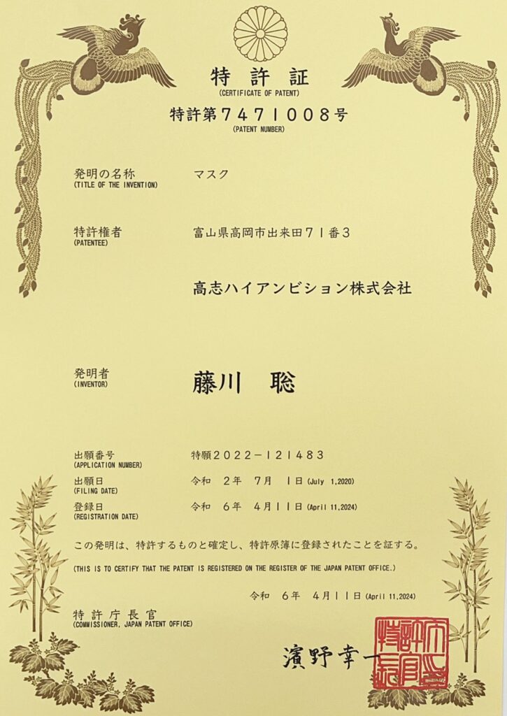2021年より当社が開発・改良をしてきた「つけたまマスク」が、新しく二つ目の特許を取得いたしました。(特許番号7471008号)